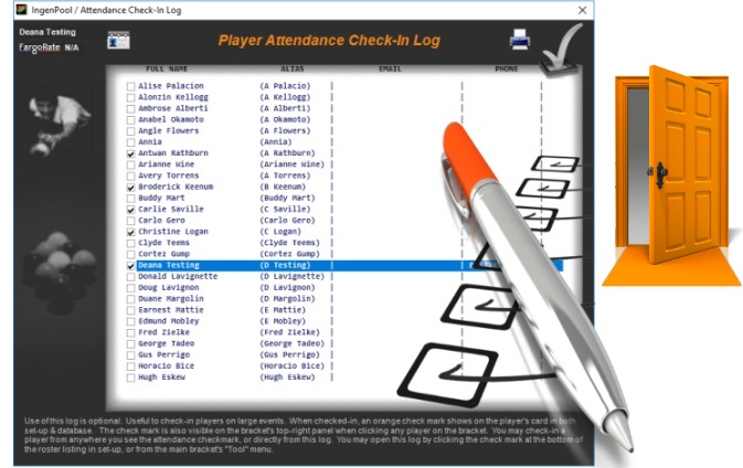 This log is available for all events. Useful to check-in players on large events. When checked-in, an orange check-mark shows up on the player's card and in key locations. You may check-in a player from anywhere you see the attendance check-mark. Access the database from the log to generate quick "Expediting" text-messages.