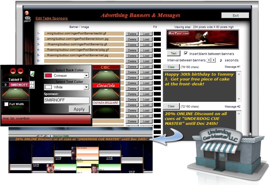Banner-rotation, scrolling messages, and the latest in our standard feature line-up; table sponsorship. This feature allows you to identify your tables by name & sponsor colour, instead of numbers. When a sponsorship name is in use, the dispatch window, text-messaging, scorecards, and any other live messages in use during tournament will refer to the table by its sponsor name. A selection of font & colour is available to match the sponsor colours and logo as closely as possible.