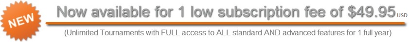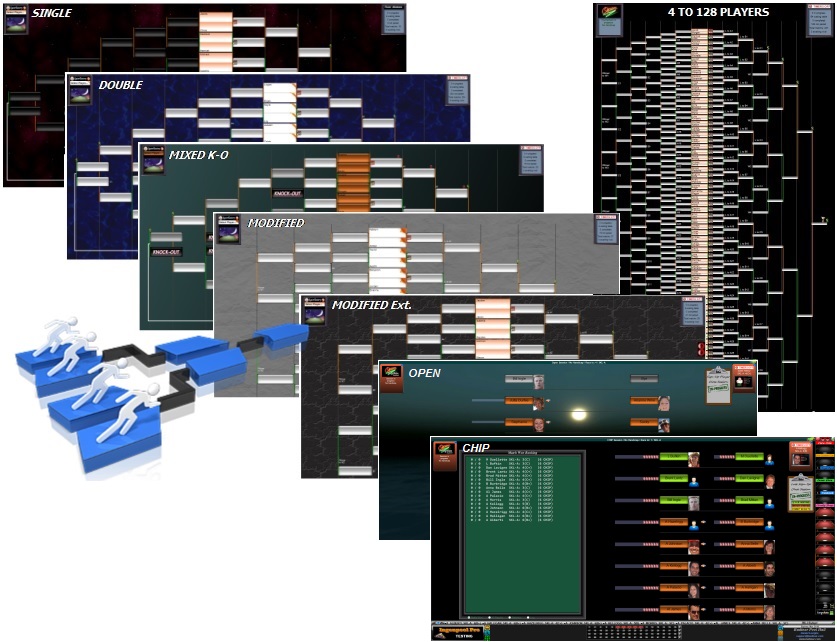 The traditional "Single" & "Double", the "Mixed K-O" which turns a double into a single at a user-selected stage, the "Round-Robin" great for weekly-play @ 1 round per week, and the "Modified" (EURO) where a user-selected number of players from the loser-side returns to the winner-side. Recently added are the increasingly popular and entertaining "CHIP" format, and the versatile "OPEN" format to keep track of various match results within a specified time period or session. Check-out our tutorial video section for more detail on these 2 new formats. All formats are fully automated, and supported by numerous hard-copy reports, which greatly simplifies any tourney preparation & management. A Buy-back option is also available on the Double, Miked-KO and Modified.
