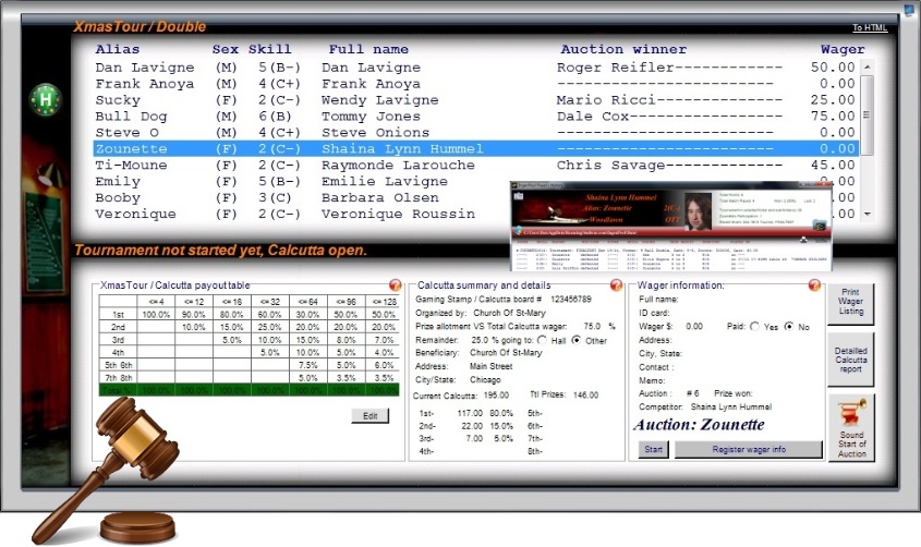 The built-in Calcutta manager provides everything you need to efficiently run an auction. All players are automatically loaded on the Calcutta listing, and the payouts are computed live as the auction progresses. You can specify a percentage going to a beneficiary of your choice, register all bids and bidder info, and print detailed reports of all biddings & winnings.