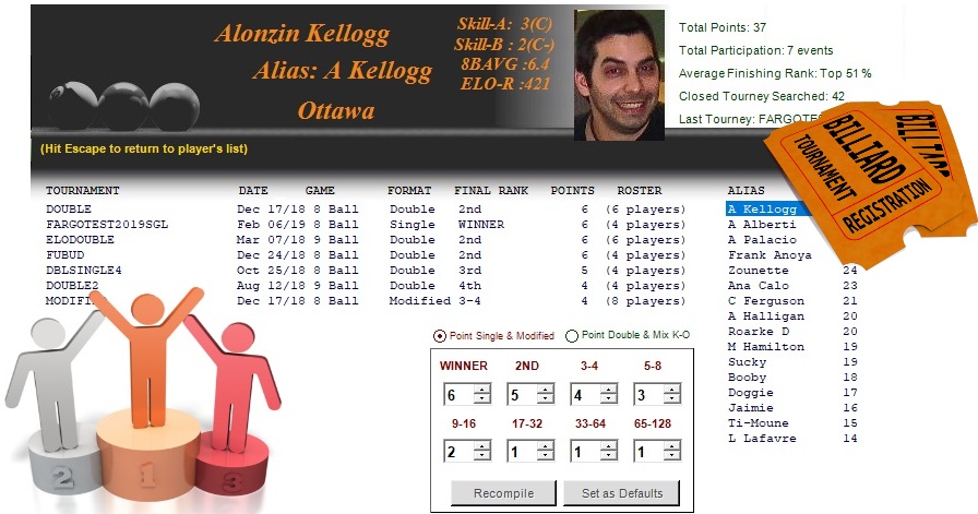 The Player-History provides a compilation of all matches previously played, including opponent name, skills, final scores, points accumulated, money won, final position, time of play, table #, etc. The History is available from the Calcutta & database window, and is extremely useful to evaluate skill level change, and during auctions. As with the "Point compiler", the compilation is performed on user-selected tournament-directory content. It is up to the tournament manager to properly categorize all completed tournaments (season, year, division, etc).