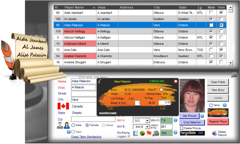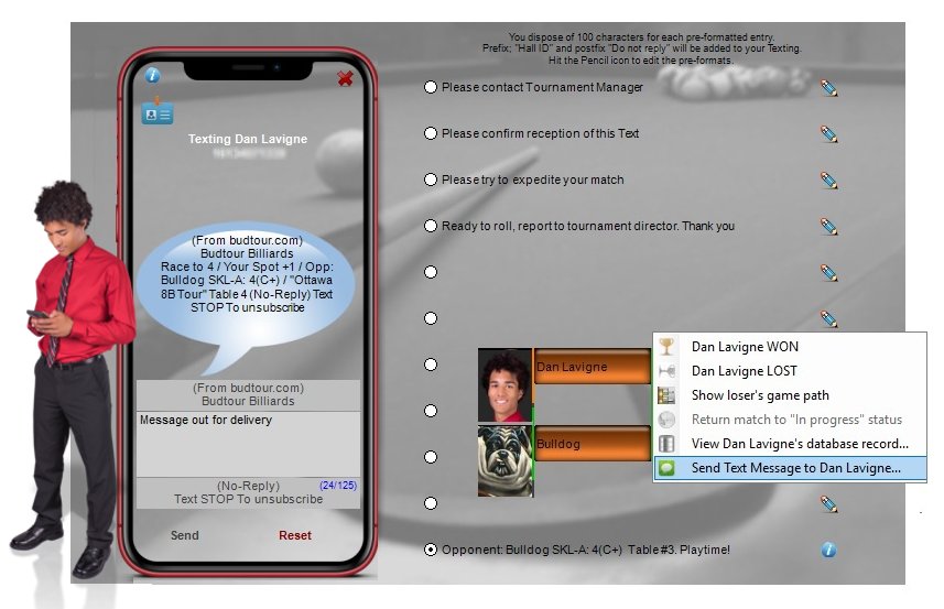 Once a player/team is recorded, registering them for a tournament is only 1 right-click away. The database can hold an unlimited amount of detailed records, and features built-in text-messaging capability.