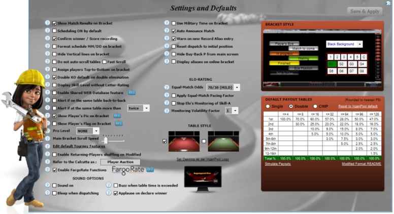 A multitude of options can be turned ON/OFF to fit your management style. This is also where your default payout-table is adjusted for each format. A selection of bracket graphics & backgrounds can be selected, and you may even select your own background image.