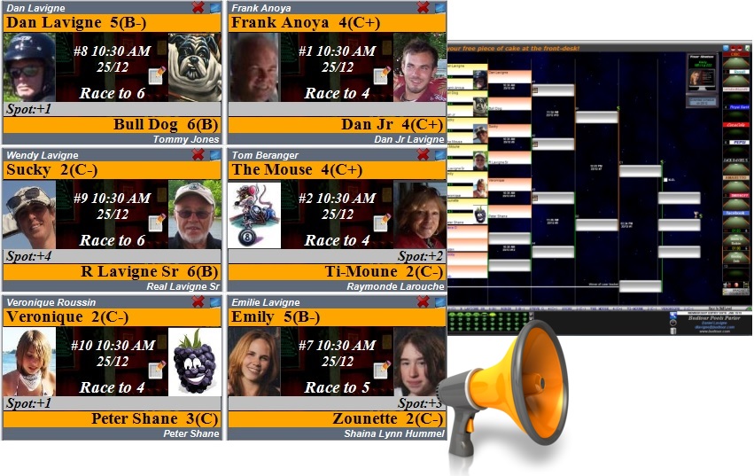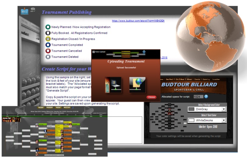 Publish your tournaments online, with bracket and full details, including players' pictures & match results. Use IngenPool's code-generated script to embed your tournament's listing & bracket on your own website, or direct your customers to www.budtour.com/letsroll. You can set Ingenpool to automatically refresh the WEB content every time a change in the bracket is recorded. The new brackets are now viewable on smart-phone, and more WEB features are in development.