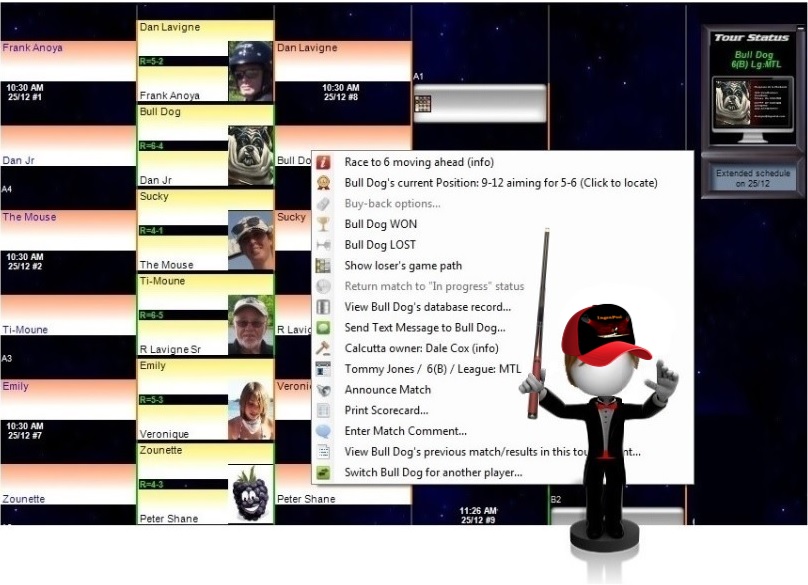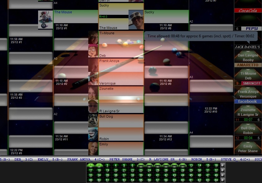 Inserting the player's picture or avatar in your database reflects professionalism, and allows everyone, both players and spectators, to positively identify all participants during every stage of the event. There's no better way for players to show their colors. This feature is often a source of entertainment on it's own and gets the players and spectators cheering in a whole new way! For International tournament events, Ingenpool can be set to display the player's country flag in lieu of the pictures. The pictures are shown on the bracket at the current player positions, on the dispatch window, printed on the scorecards, and on the WEB when the tourney is published.