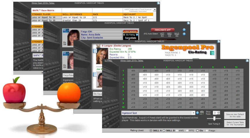 You may set race defaults for every format and bracket size, and fine-tune per tournament. An handicap will override the races based on player's skill. Ingenpool offers 16 selections; 4 pre-sets, 9 customizable, NAPA, ELO Equal-Match, and Fargorate Fairmatch. Tourney defaults can also be set for every formats. IngenPool will refer to these settings to prepare scorecards, compute table time-allowed, populate the Dispatch Window, etc.