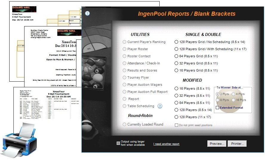 IngenPool offers a wide range of HTML export & hard-copy reports to support your events. Flyer, bracket, ranking, roster listing, etc. All printable on regular 8.5 x 11, with the exception of the 128 bracket requiring minimum 8.5 x 14.