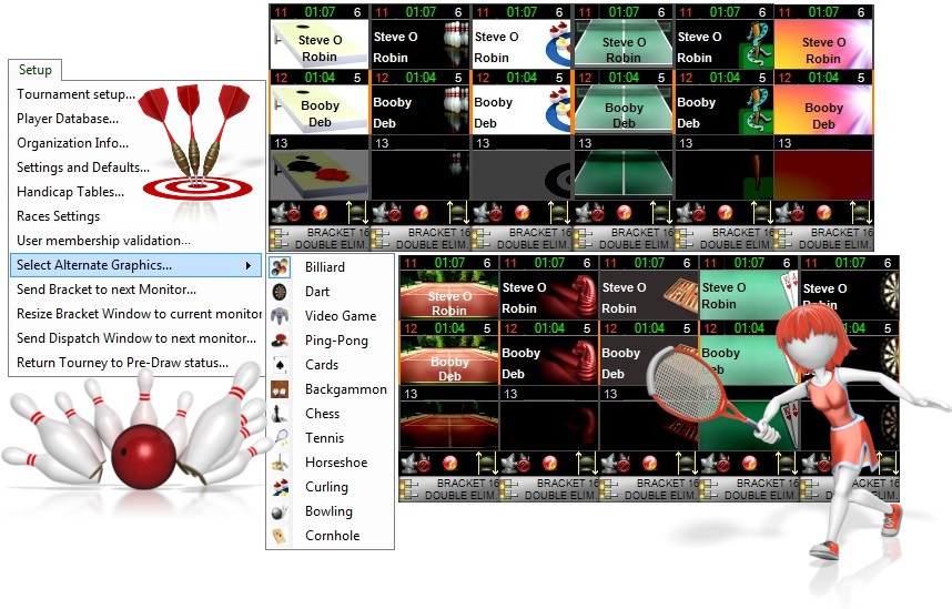 Due to its ease of use and versatility, IngenPool, although specialized for Pool & Billiard events, is often used to manage other types of tournaments. A variety of alternate graphic packages are at your disposition to better represent alternative events, a must when the brackets are on HDTV.